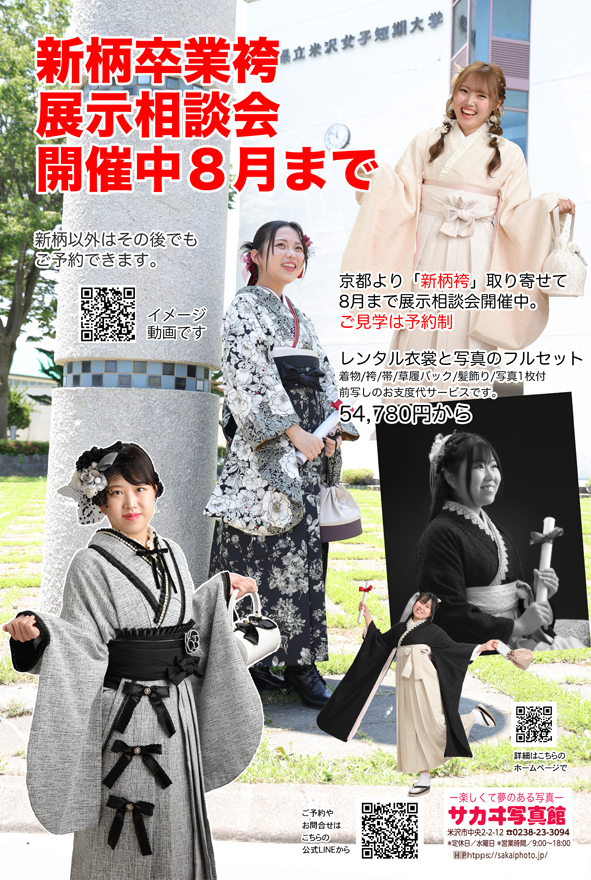 山形県米沢市周辺(東置賜郡川西町、高畠町、南陽市、長井市、西置賜郡飯豊町、小国町、白鷹町、福島市、喜多方市、会津若松市)でスタジオ記念写真、動画、レンタル着物、ドレス、卒業アルバムなどのお問い合わせはこちらから。