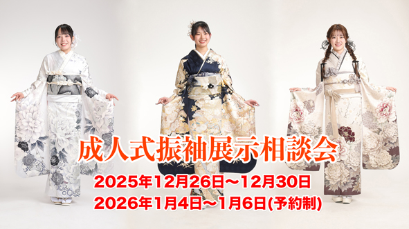 年末年始、春の大型連休、お盆休みと年3回「新作振袖展示相談会」をやっています。
